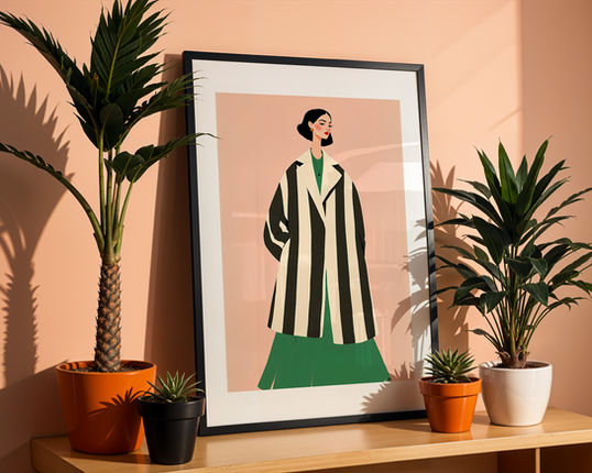 Effortlessly sophisticated, The Striped Coat captures the essence of modern femininity through bold fashion styling and refined minimalism. Featuring a striking monochrome coat layered over deep green tailoring against a soft blush backdrop, this artwork embodies the composure of high fashion editorial with an understated luxury finish.